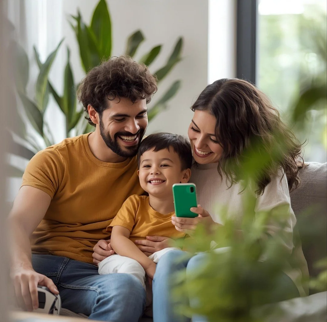 Smiling small family enjoying a mindful home — natural light, cozy yet stylish interior, greenery in background.