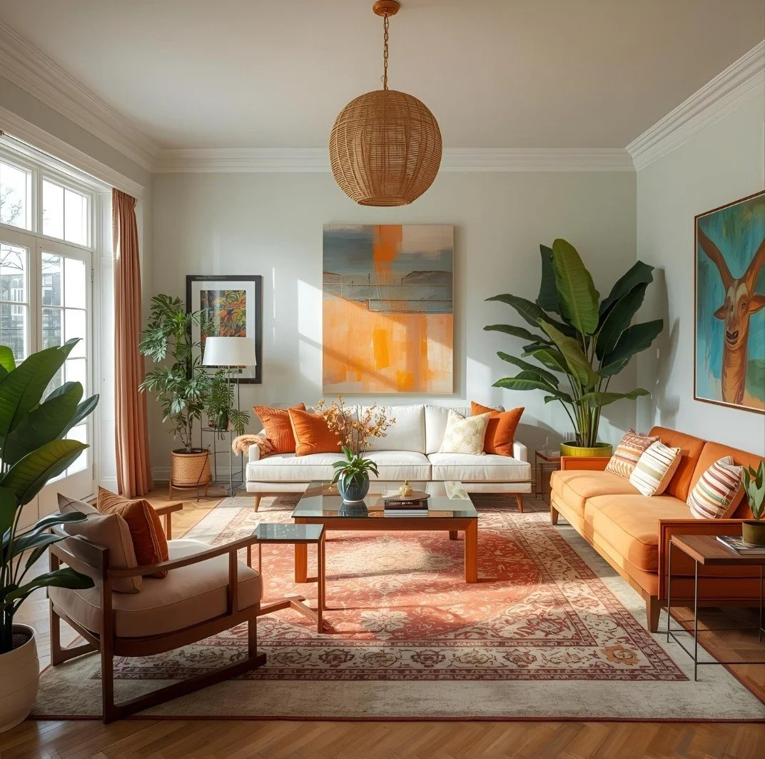 Balanced living room arranged by Feng Shui — plants, art, and furniture positioned harmoniously.