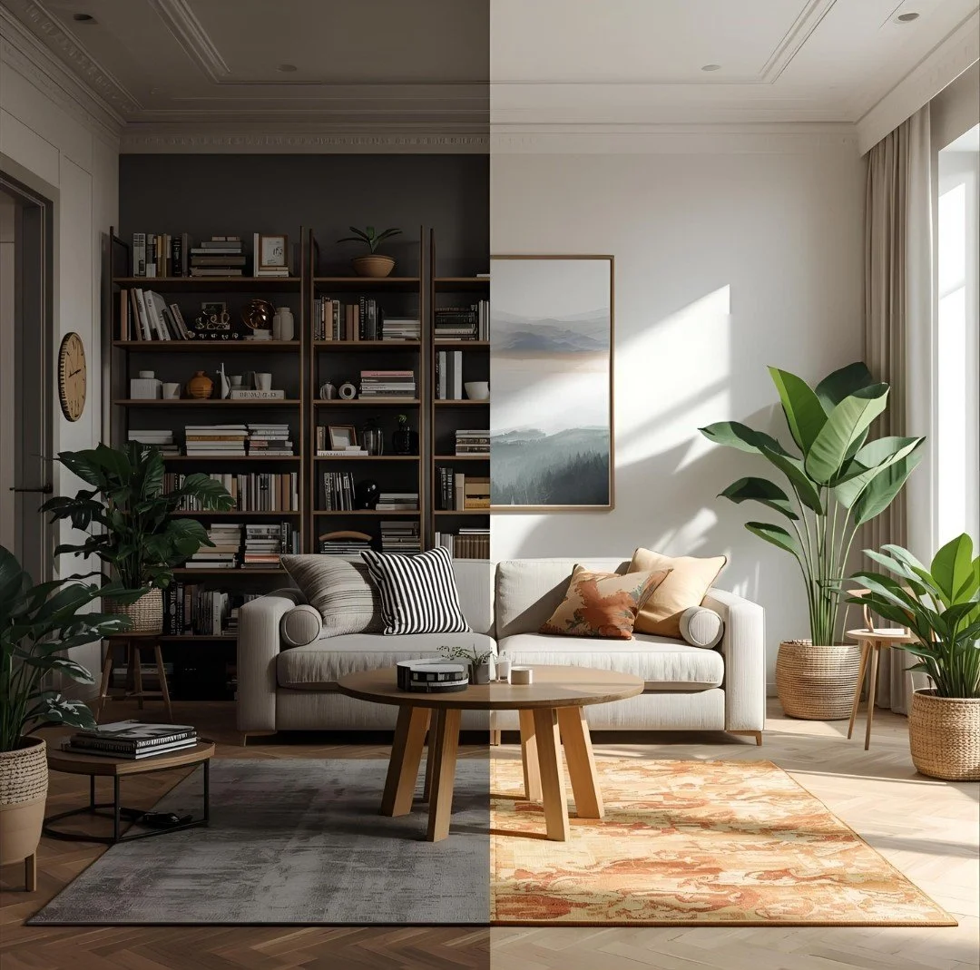 Split-view interior concept: one side cluttered and dull, the other serene, colorful, and balanced — showing transformation through mindful design.