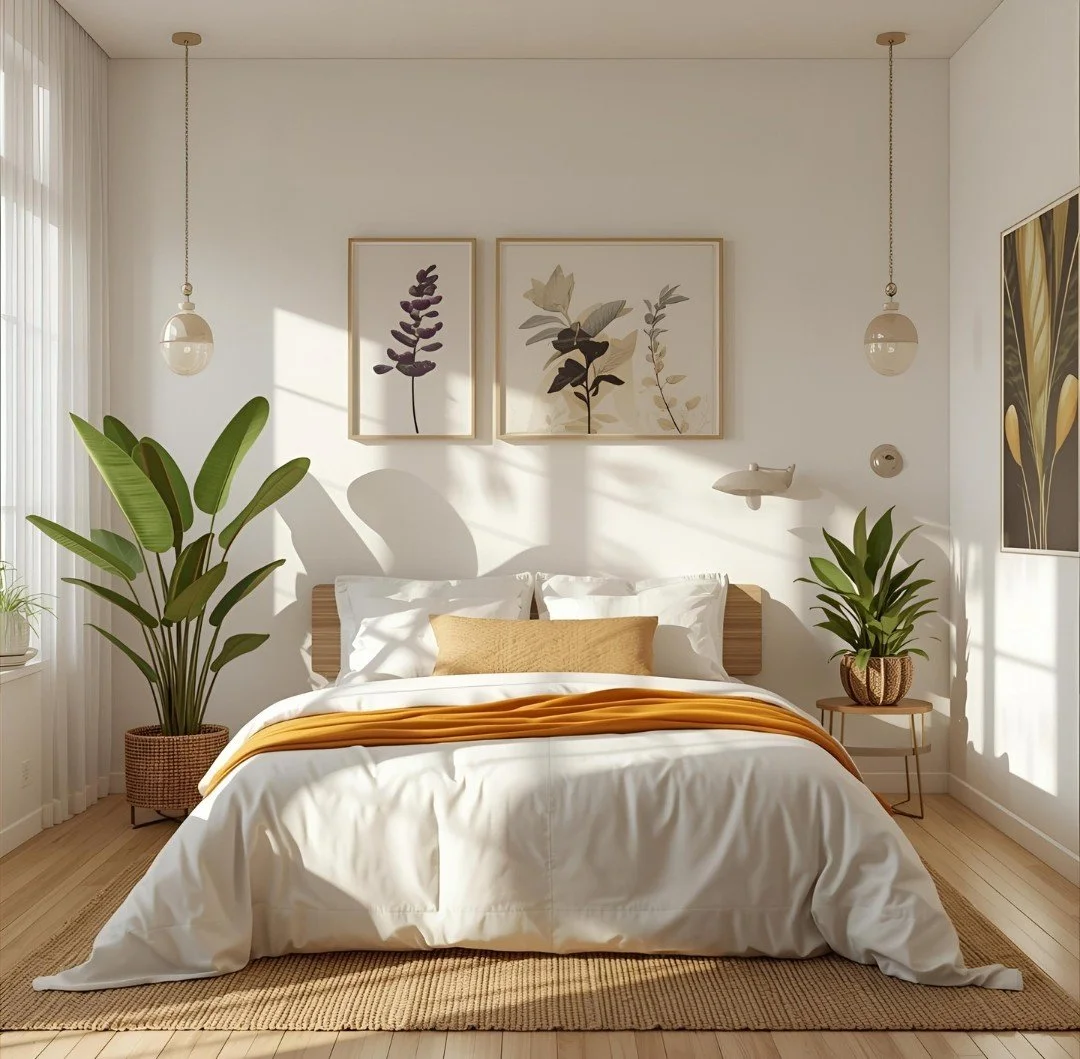 Bright bedroom with soft morning light, plants, and calming color palette of greens and creams with hints of amber.