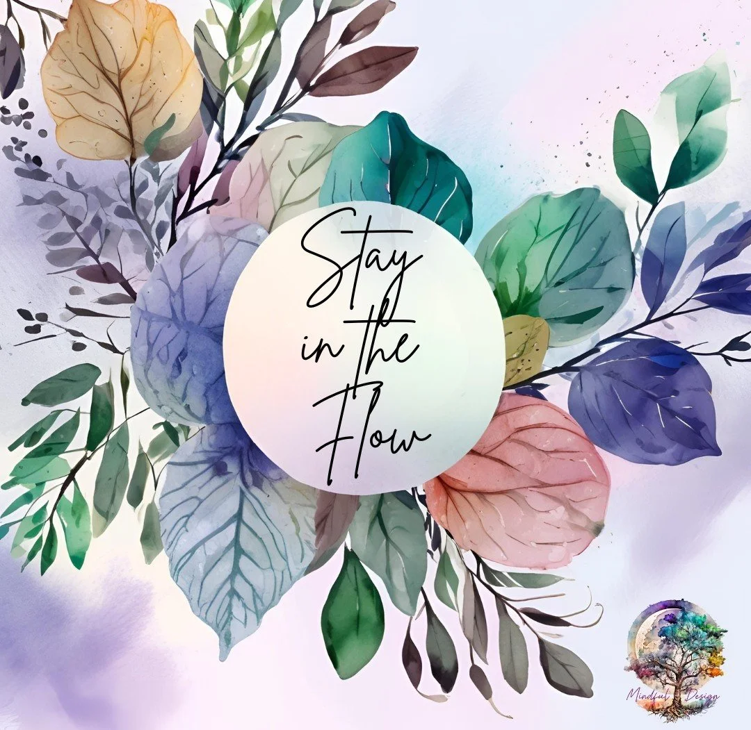 Watercolor image inspired by sunlight through leaves with ‘Stay in the Flow’ the text overlay.